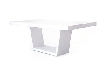 Mesa de comedor moderna con base central de canto angular. Realizada en madera con acabado de laca brillante.