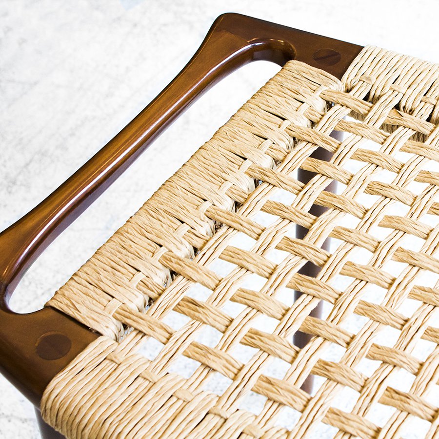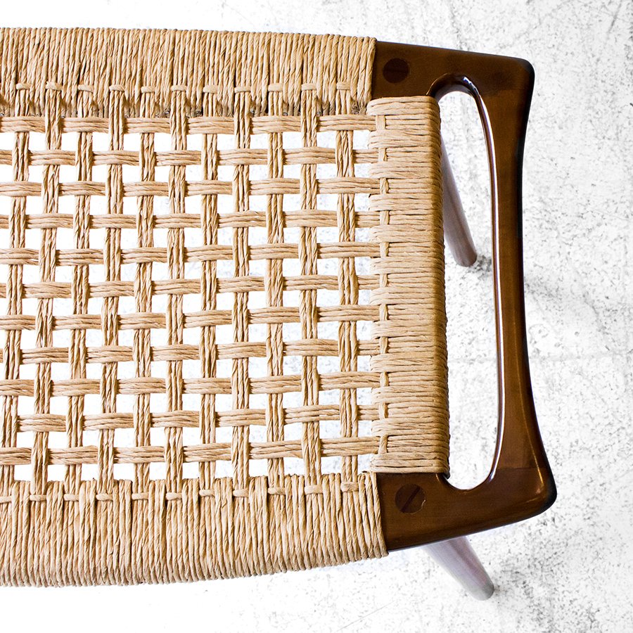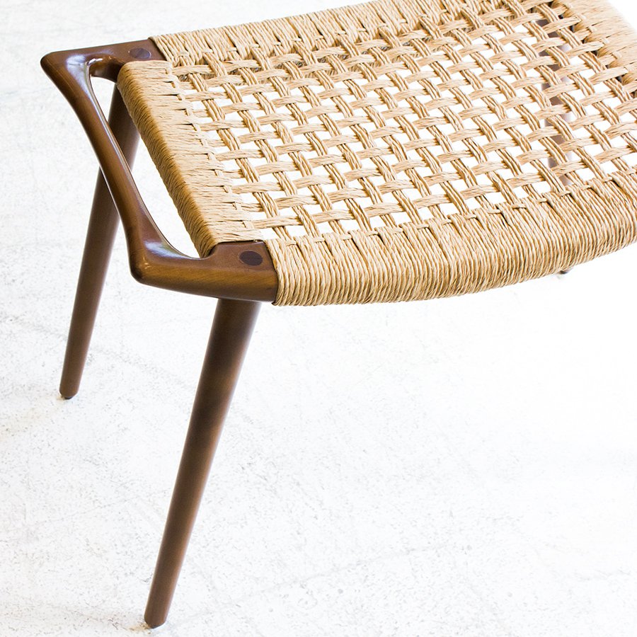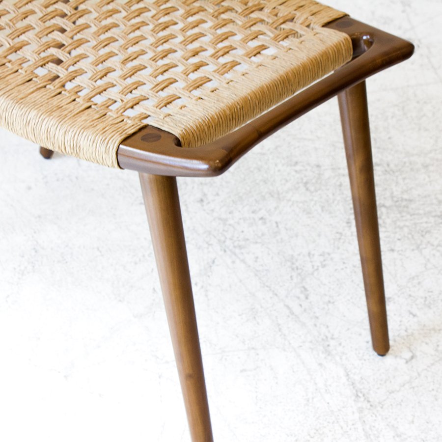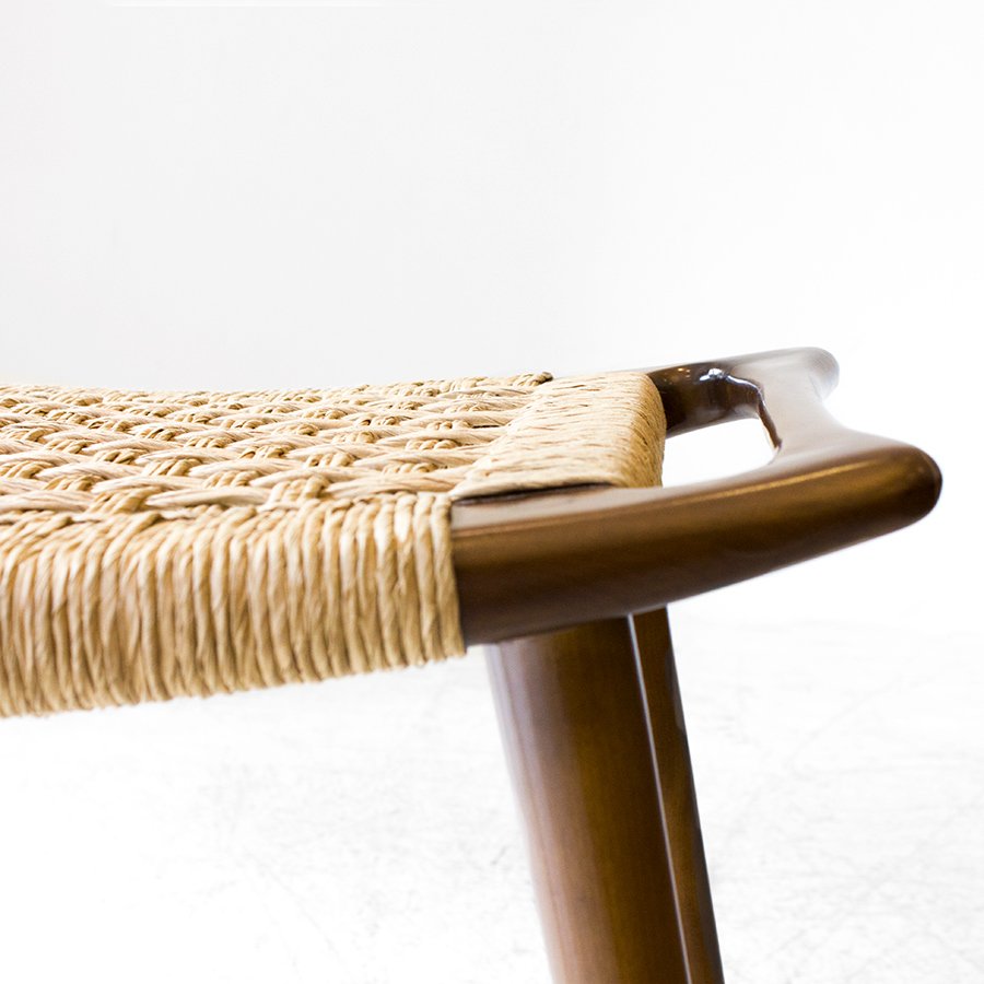 Diseñado en 1953, este banco se luce por las sutilezas formales que lo componen, como el asiento ligeramente curvado y el tejido realizado con hilado kraft o caña. Su medio es de guindo macizo y el material de tejido que se elija, y está compuesto por cuatro patas cónicas debajo de un marco rectangular ligeramente curvado hacia arriba con un panel de asiento tejido. Wegner integró las asas en la forma del asiento, abordando la portabilidad, otro aspecto de la función de un taburete y la facilidad de uso. El banco JH 539 ejemplifica la capacidad de Wegner para crear un asiento hermoso y cómodo, uno que se mantuvo fiel a su nivel de extraordinaria artesanía.